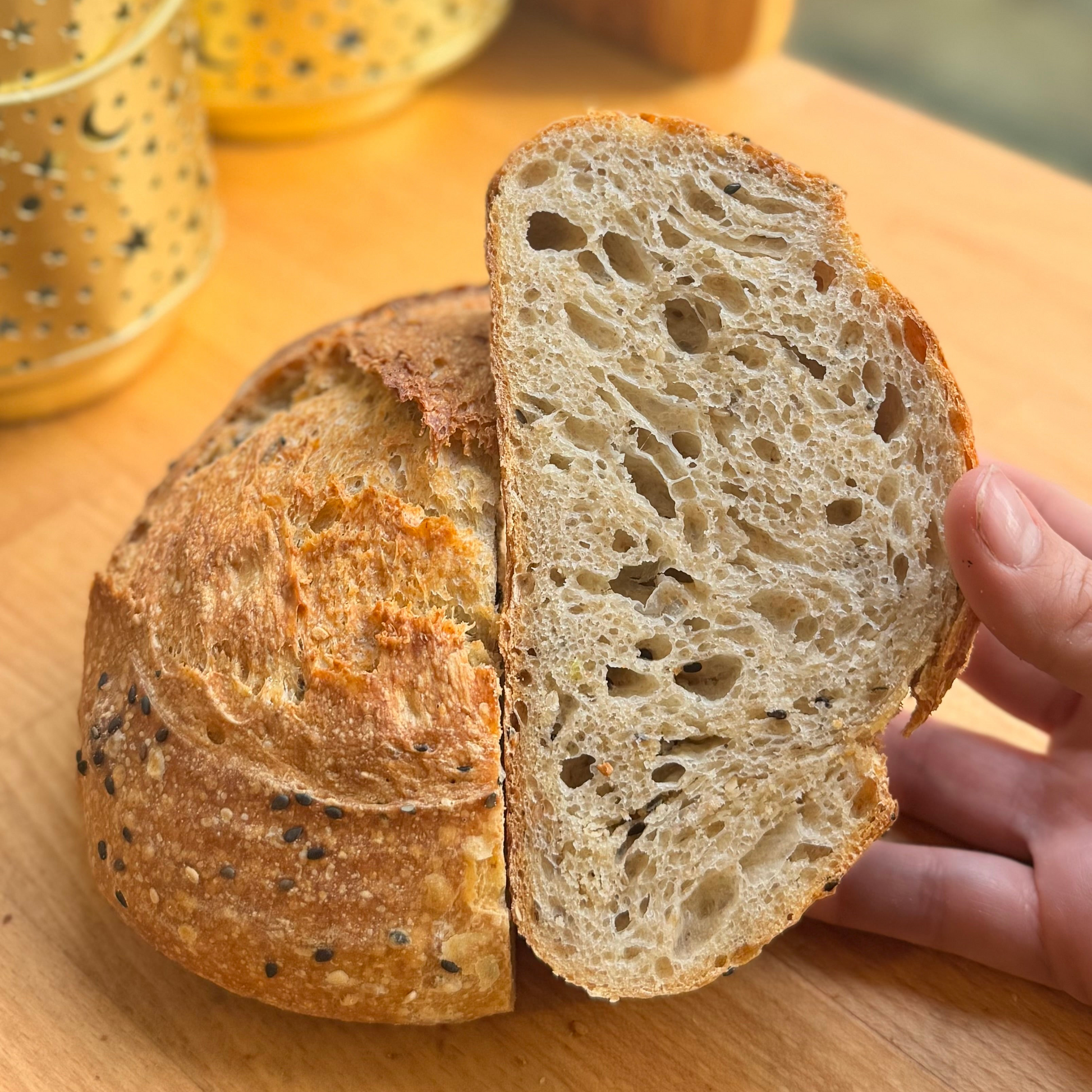A generous mix of seeds gives the loaf its name and purpose. Flax and chia support digestion and natural moisture, nigella adds an earthy note, while sunflower and sesame contribute richness, minerals, and a warm, toasted finish. Slow sourdough fermentation transforms the dough, deepening flavor and making the bread easier to digest while allowing the grains and seeds to fully express themselves.